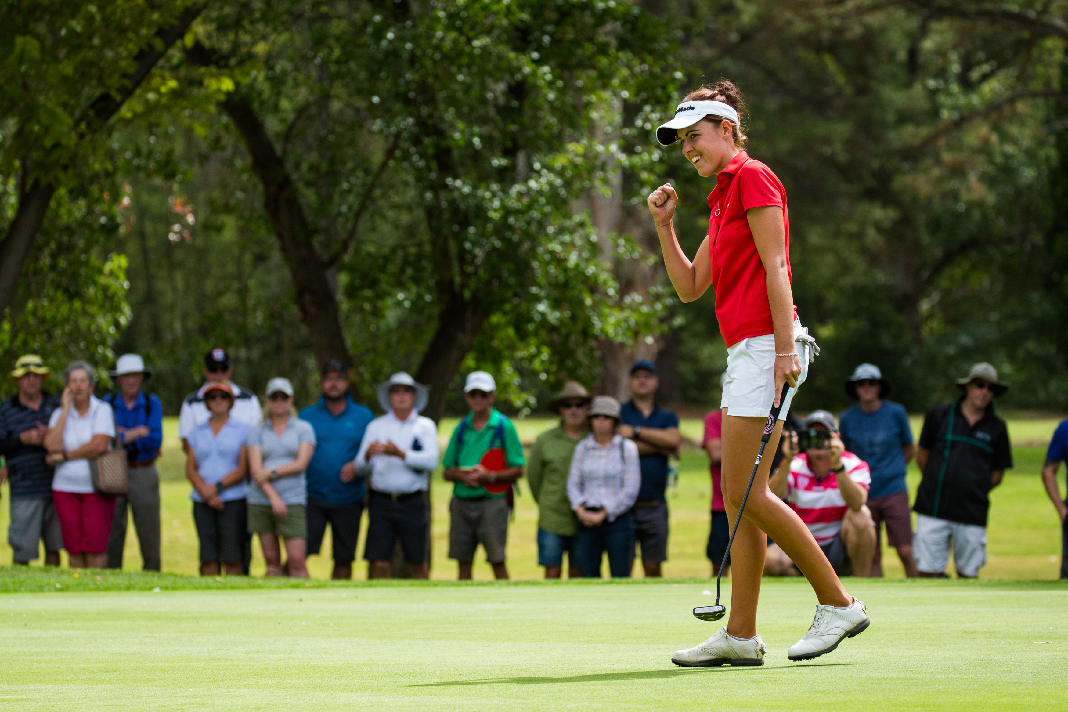 Maclaren salutes her win on the 18th after holding off Sweden’s Lynn Carlsson and Kiwi Munchin Keh. Picture by TRISTAN JONES
