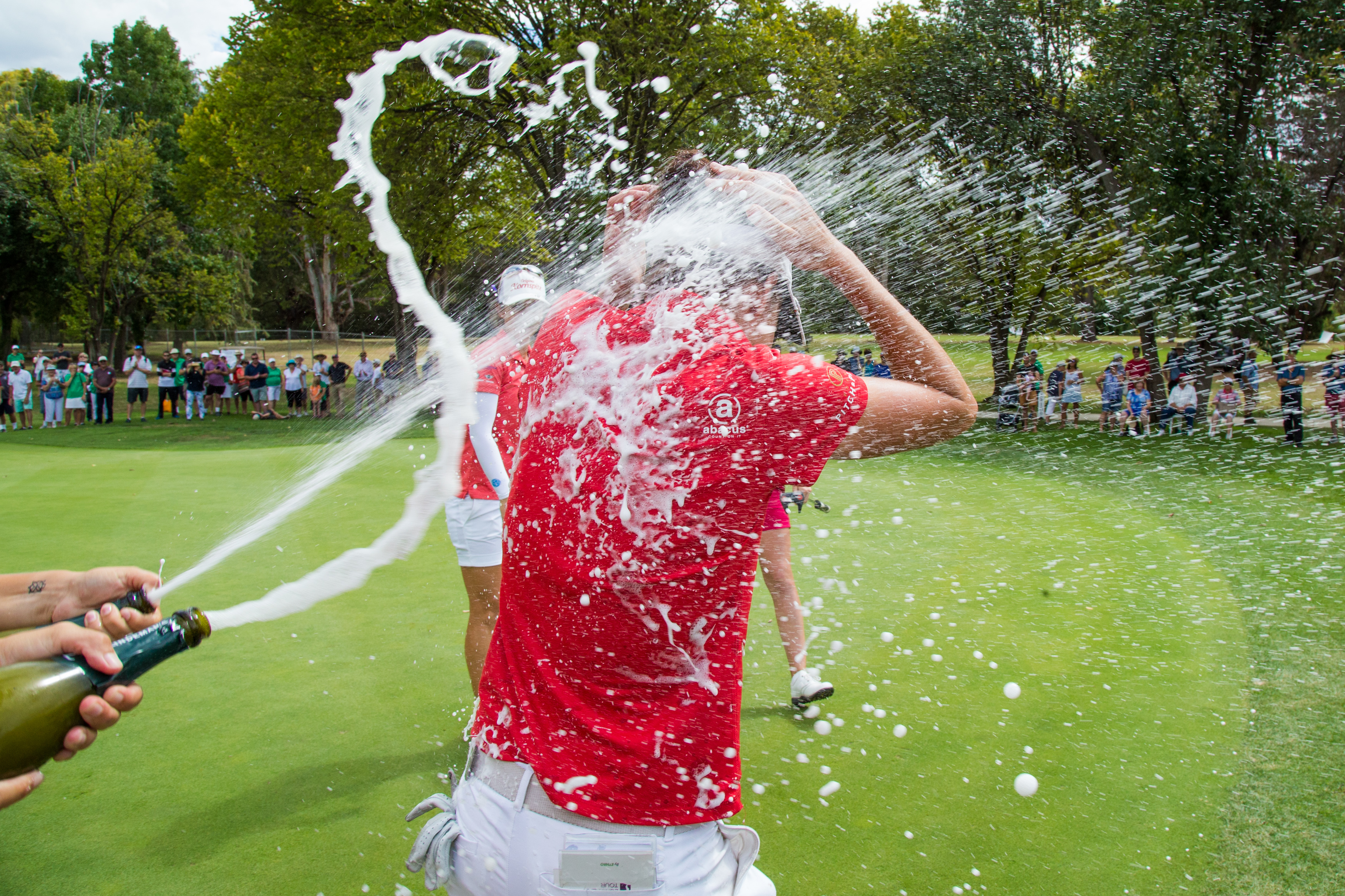 MacLaren is showered with champagne on the 18th green at Queanbeyan Golf Club. Picture by TRISTAN JONES
