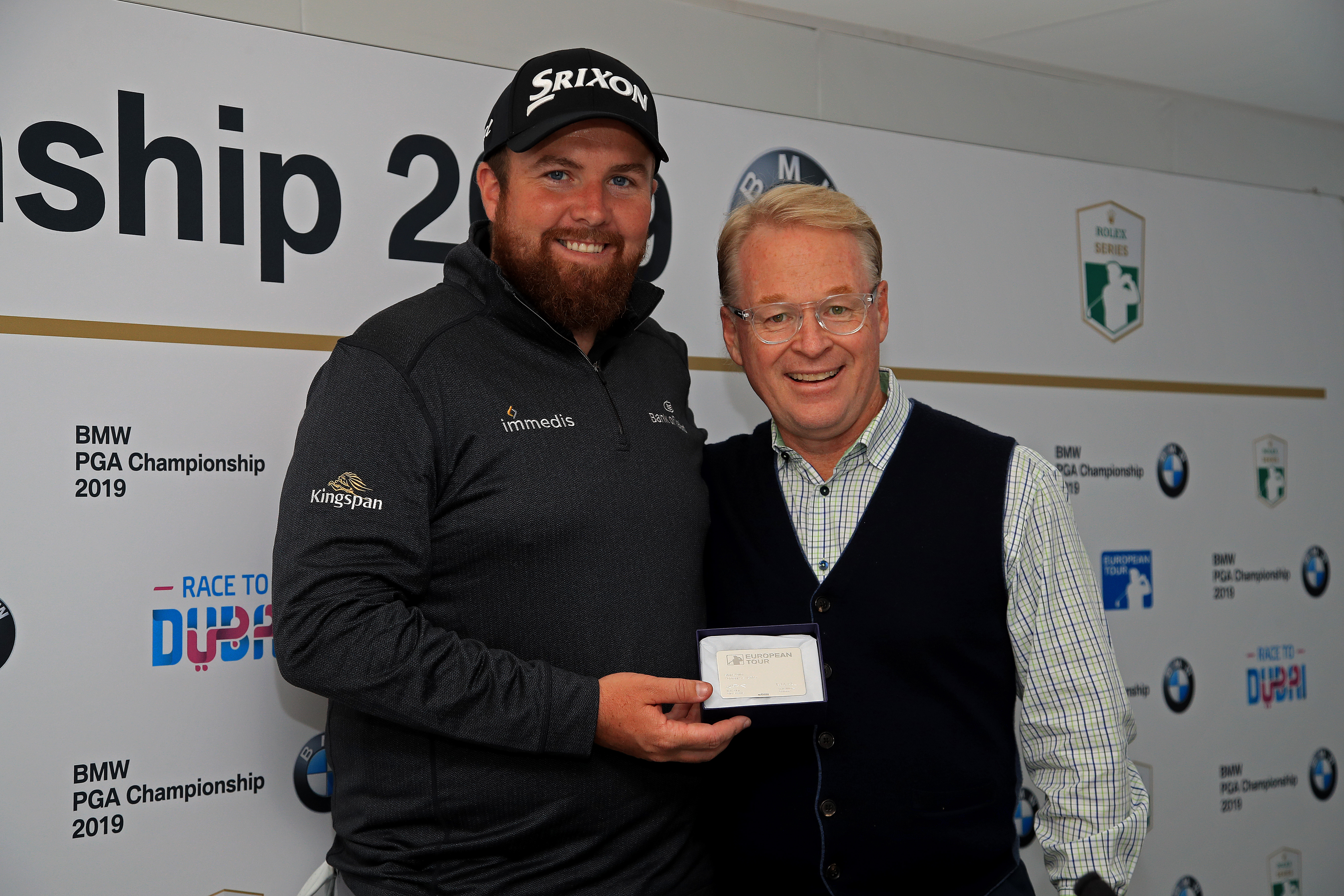Open champion Shane Lowry receives his Euorpean Tour honorary life membership from chief executive Keith Pelley, at Wentworth, in the build up to this week’s BMW PGA Championship. Picture by GETTY IMAGES